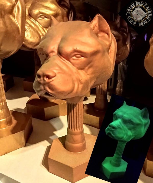 Hoofd op pilaar Verkrijgbaar in de kleuren: Goud, Oud goud, Zwart, Brons, Zilver, Neon Roze, Neon blauw. Glow in the dark is mogelijk (valt oranje/bruin uit)
